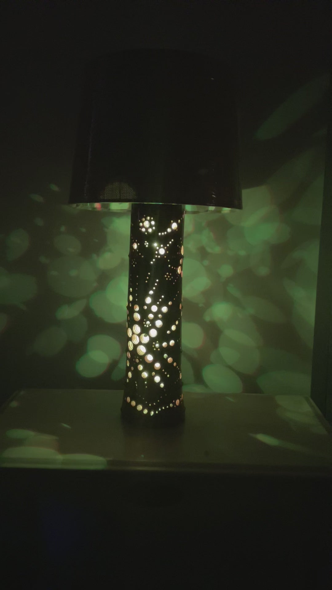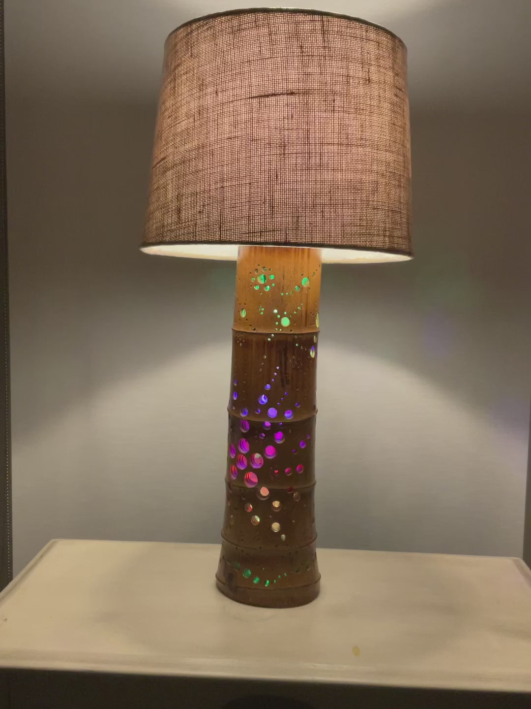 Uniquely hand crafted 28" table lamp. 3 way switch lets you select from upper lighting, base led effect lighting, or both.